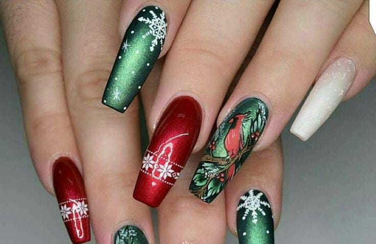 Deep red and shimmering green nails with snowflakes and a hand-painted bird create a rich, elegant holiday look full of seasonal warmth and Christmas charm.