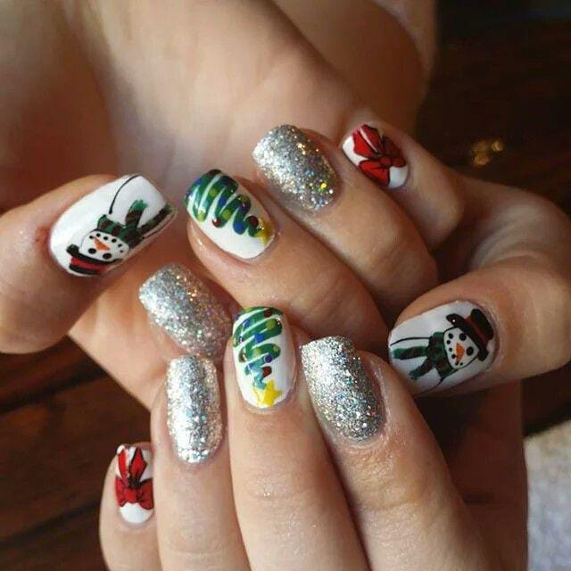 A cheerful mix of silver glitter, white polish, snowmen, and Christmas trees — this design feels joyful, bright, and full of holiday spirit.