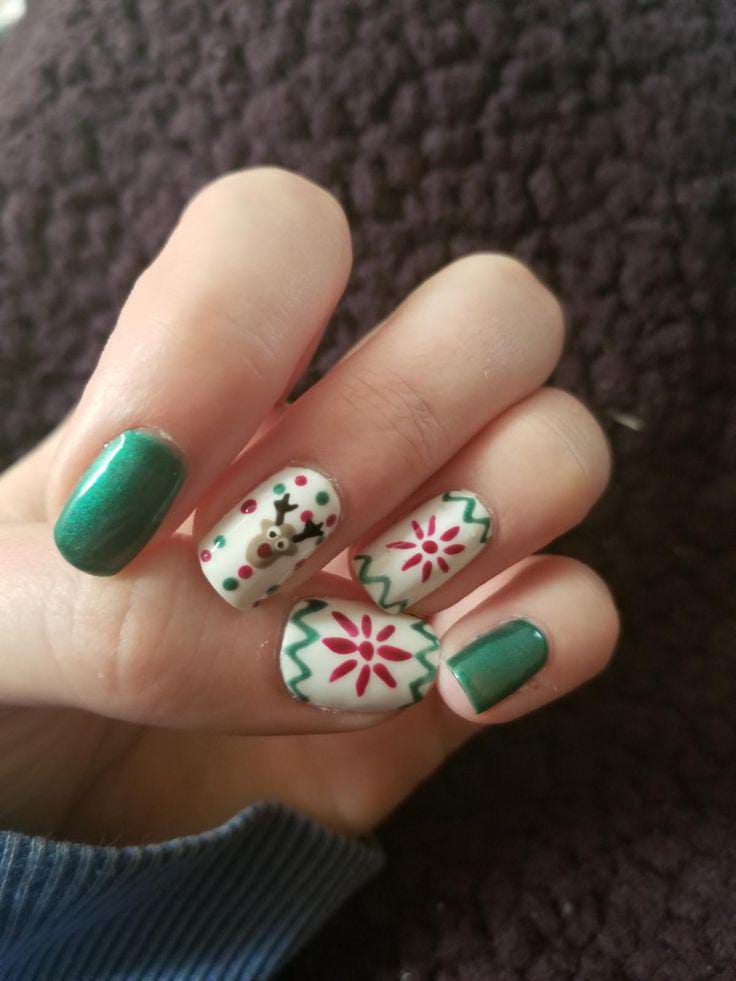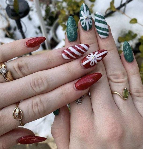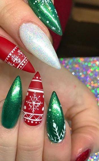 Combining green shimmer and white nails with red and green festive patterns, this design mimics cozy Christmas sweaters — warm, fun, and full of seasonal charm.