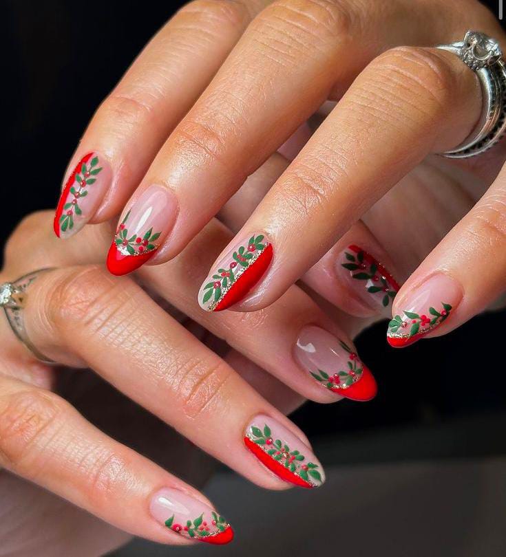 This design features elegant almond-shaped nails with glossy red French tips and delicate green leaves accented by tiny red berries. It gives off a chic Christmas holiday vibe — festive yet sophisticated.