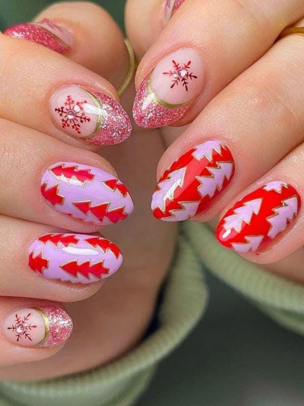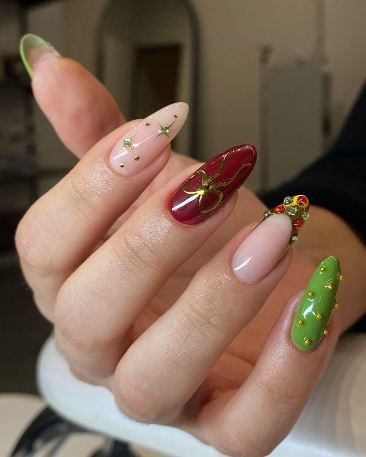 This look blends deep red, emerald green, and nude tones with touches of gold foil and gem accents. The mix of sparkle and bold color makes it luxurious and Christmas-party ready.