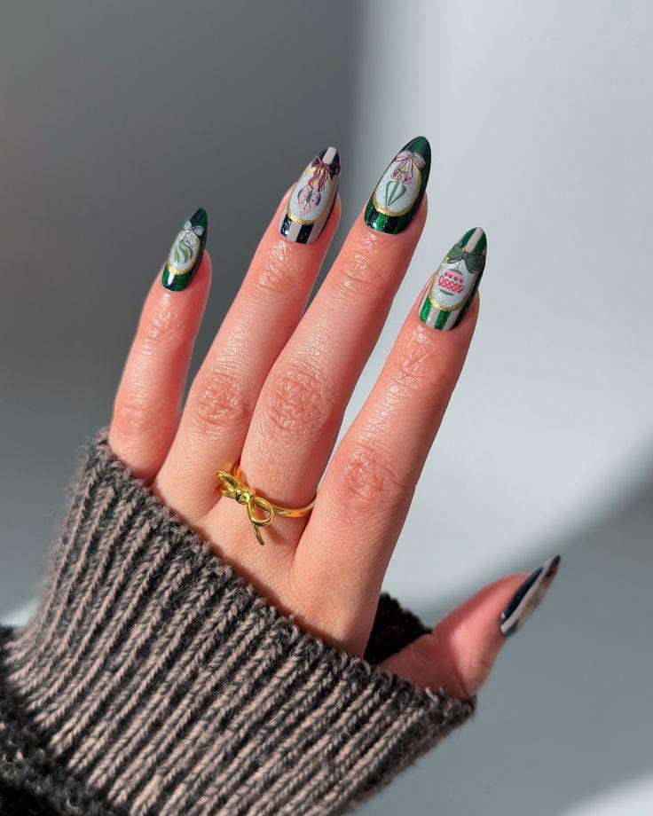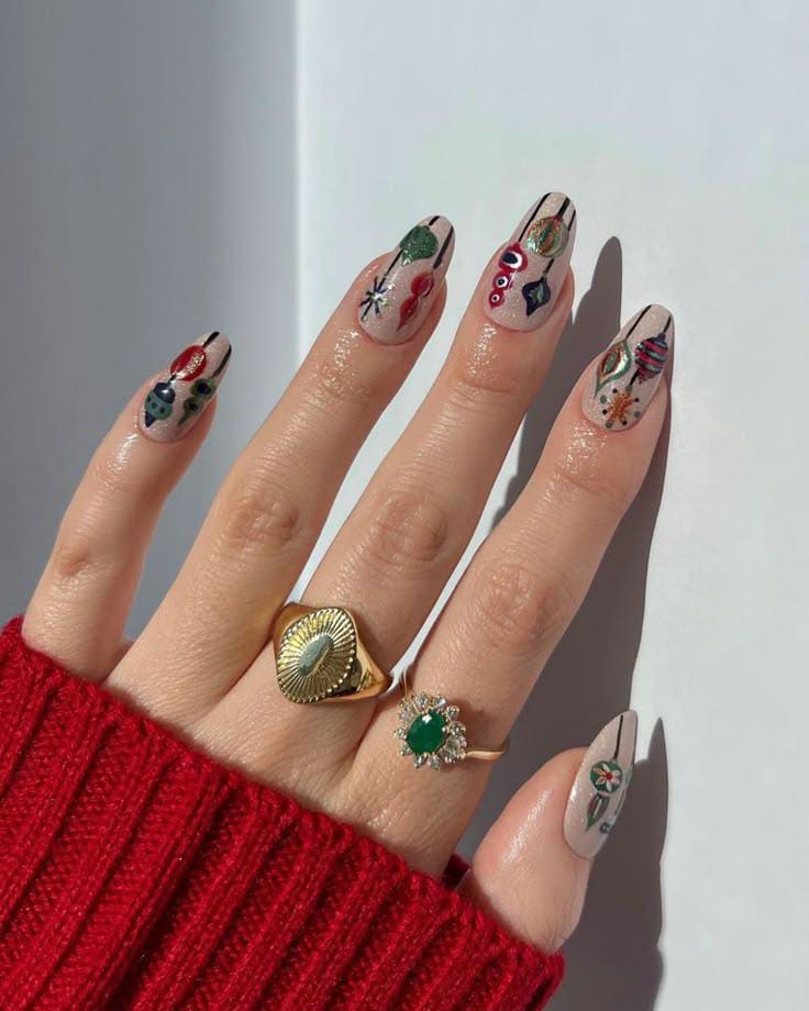 Neutral nails come alive with hand-painted Christmas ornaments, leaves, and baubles in rich jewel tones. It’s a modern twist on classic holiday decorations — detailed but still refined.