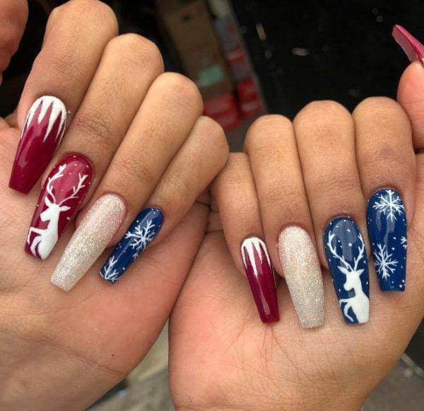 Rich burgundy and deep navy nails are paired with glittery silver and white reindeer and snowflake art, bringing a cozy, magical winter Christmas night feel.