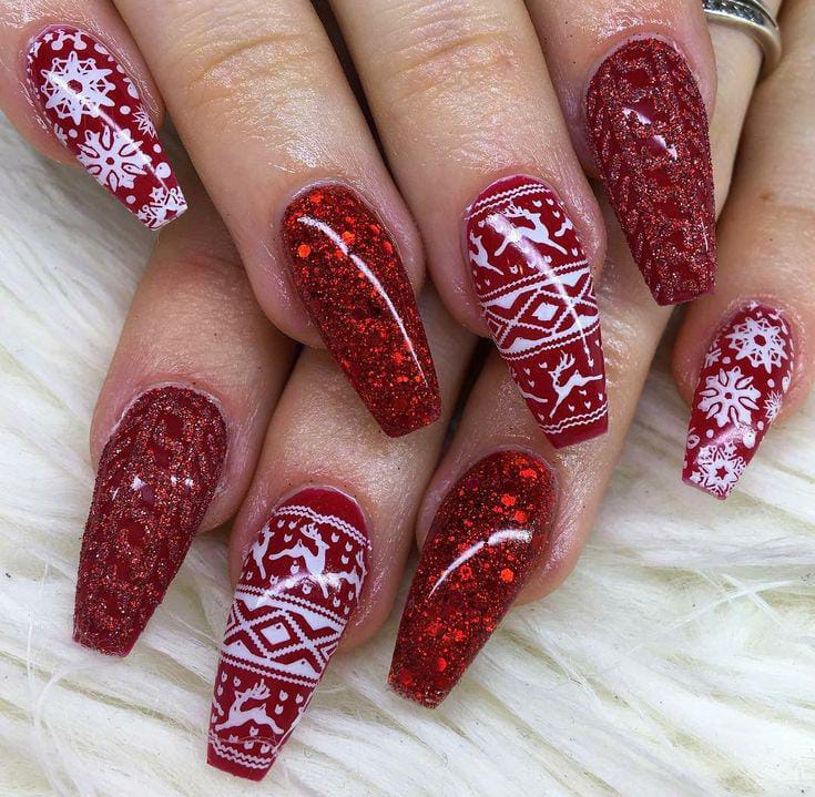 Deep red glitter nails with intricate white snowflakes, reindeer, and fair isle patterns — just like a warm Christmas holiday sweater in nail form.