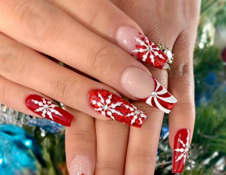 These nails combine festive red glitter with soft nude tones, accented by bold white snowflakes and candy-cane swirls. The mix of sparkle and crisp white detailing gives off a cheerful, wintry vibe perfect for Christmas celebrations.