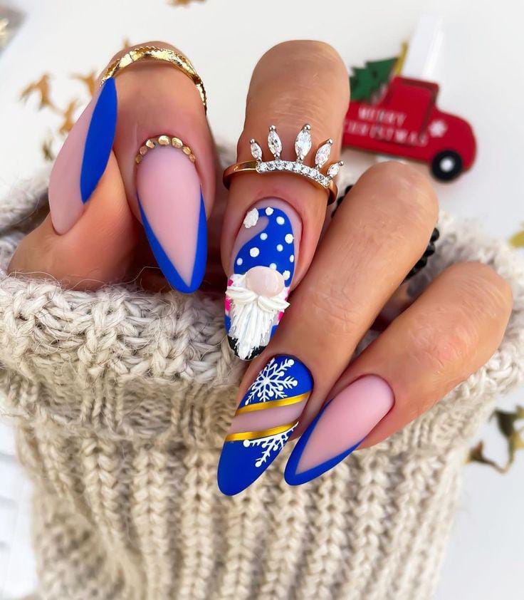 A bold and festive mix of royal blue and nude matte nails featuring a cute gnome, snowflakes, and gold accents — this design gives off cozy winter vibes with a touch of Christmas sparkle.
