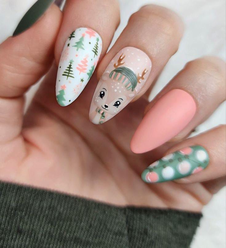 Soft green, peach, and white tones decorated with tiny Christmas trees and an adorable deer make this look sweet, gentle, and full of holiday warmth.