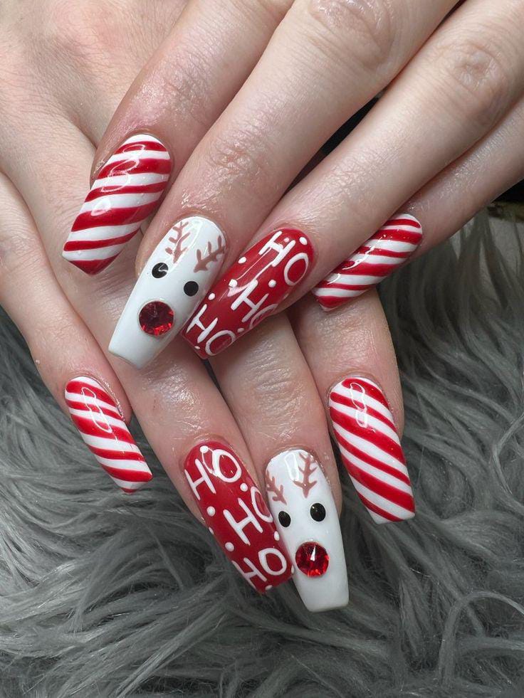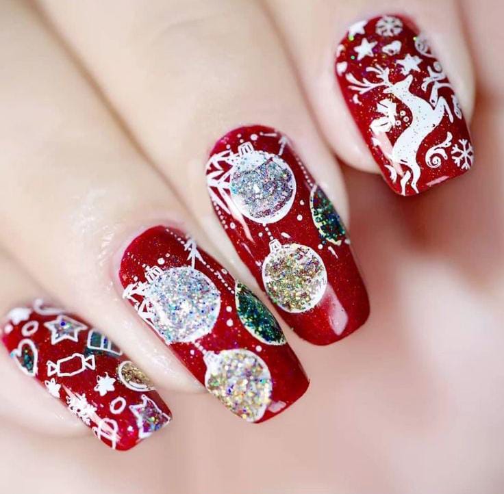 Bright red nails filled with white holiday patterns, glitter ornaments, and reindeer silhouettes give off a magical, festive sparkle perfect for the Christmas season.