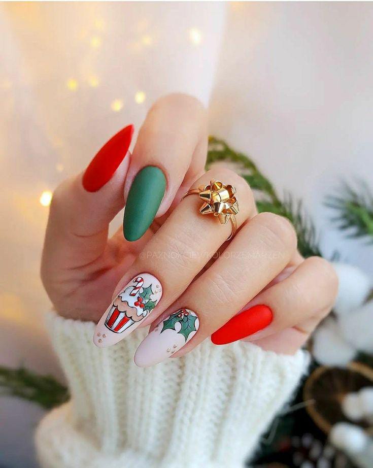 Matte red and green nails paired with holly leaves, candy canes, and Christmas pudding art — the perfect mix of classic holiday colors and cozy winter sweetness.