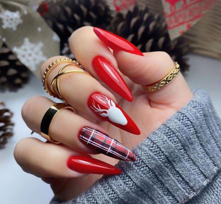Bold red nails shine with glossy polish, highlighted by a white reindeer silhouette and a chic plaid accent nail that adds a cozy, winter Christmas sweater touch.
