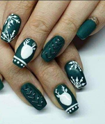 Matte forest green nails with embossed white reindeer and snowflake motifs create a sophisticated and nature-inspired Christmas holiday look.
