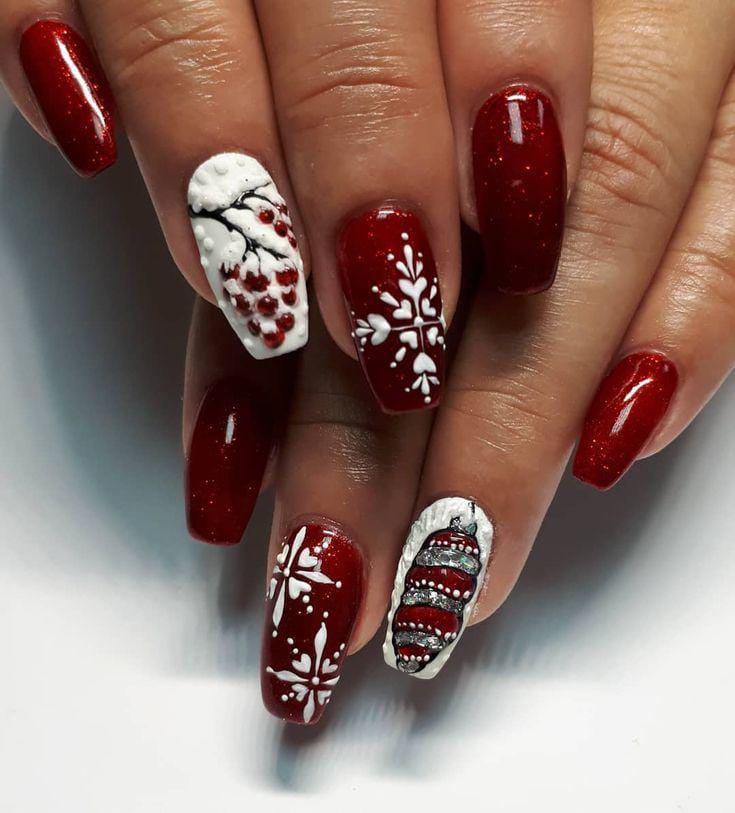Rich red nails are paired with detailed white snowflakes, snow covered berries, and textured sweater-like accents, giving a warm and classic Christmas charm.