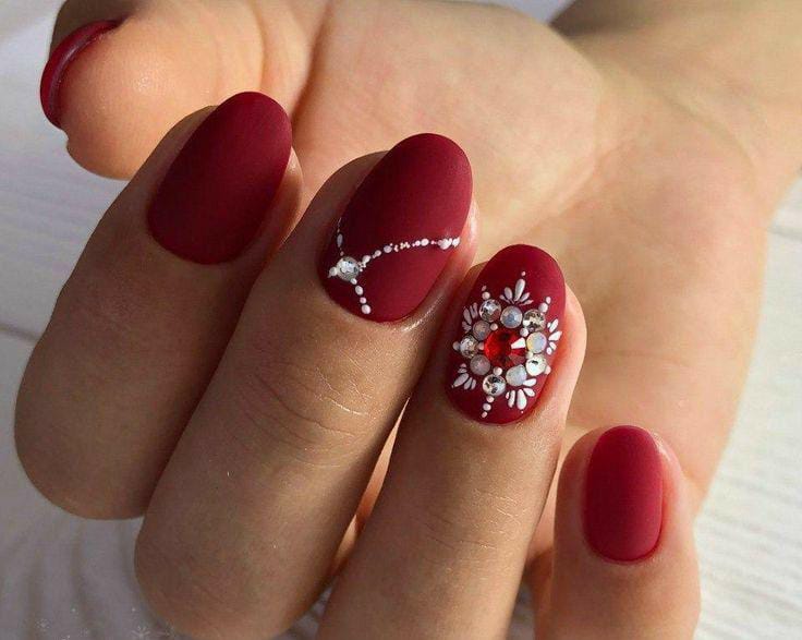 Matte burgundy nails adorned with tiny pearls and rhinestones form a stunning holiday look — simple yet sophisticated, with a touch of sparkle perfect for Christmas parties.