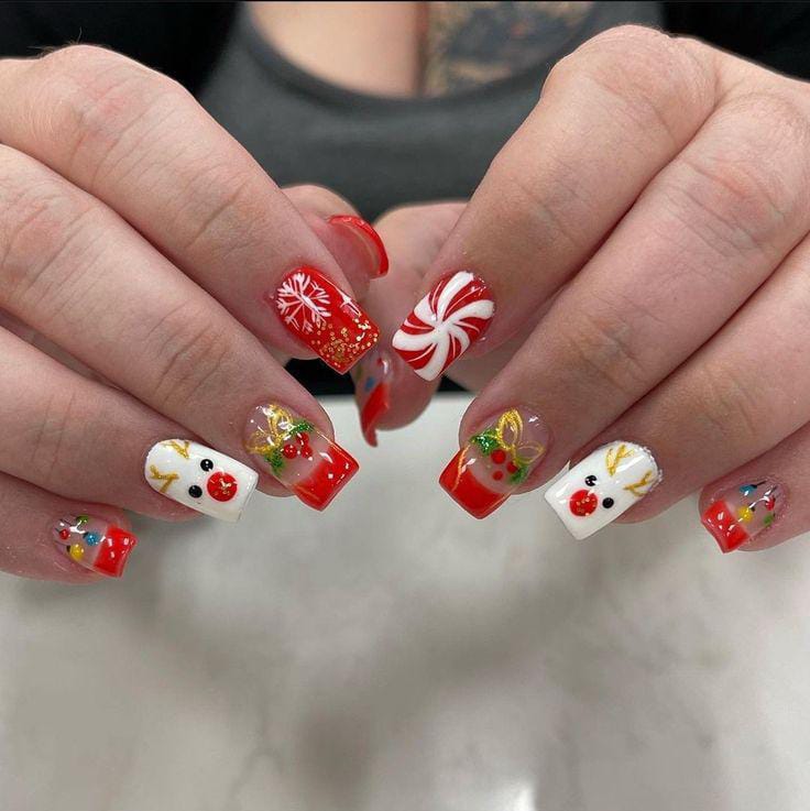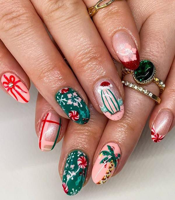 A playful mix of Christmas icons — candy canes, stars, bows, Santa, and glittery green — creates a fun, cheerful look. Perfect for anyone who loves the full festive spirit on their fingertips.