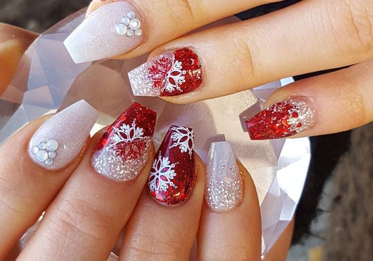 Elegant red and silver glitter nails decorated with white snowflakes and tiny gems create a frosty, glamorous winter wonderland Christmas look.