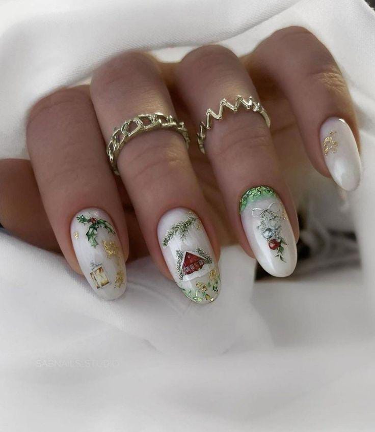 Soft white nails with delicate holiday scenes and touches of gold and green bring a magical, storybook-like charm — perfect for a calm and elegant Christmas mood.