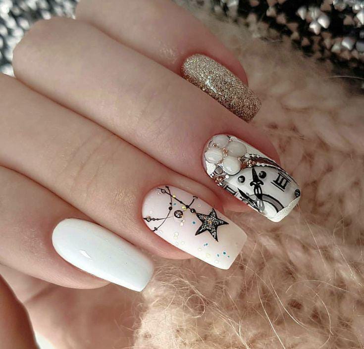 A mix of white, nude, and glittery gold shades with intricate star, pearl, and clock accents gives this design a Christmas festive and elegant New Year’s Eve vibe. It’s classy, sparkling, and full of charm.
