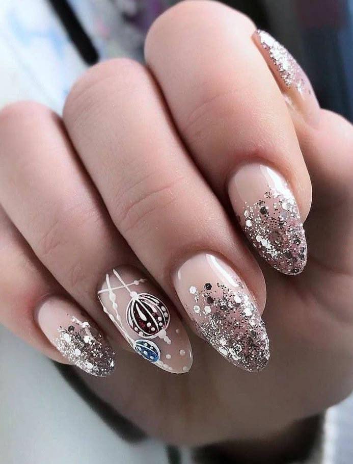 Soft nude nails blend into silver glitter tips, while one accent nail features delicate Christmas ornament art. It’s simple, chic, and perfectly festive without being over the top.
