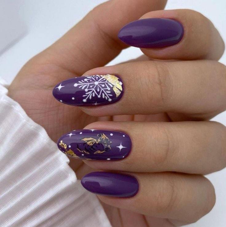 Deep purple nails with gold foil, white snowflakes, and tiny stars create a rich, wintry feel. This look is bold and luxurious—like a snowy night sky lit with Christmas holiday lights.