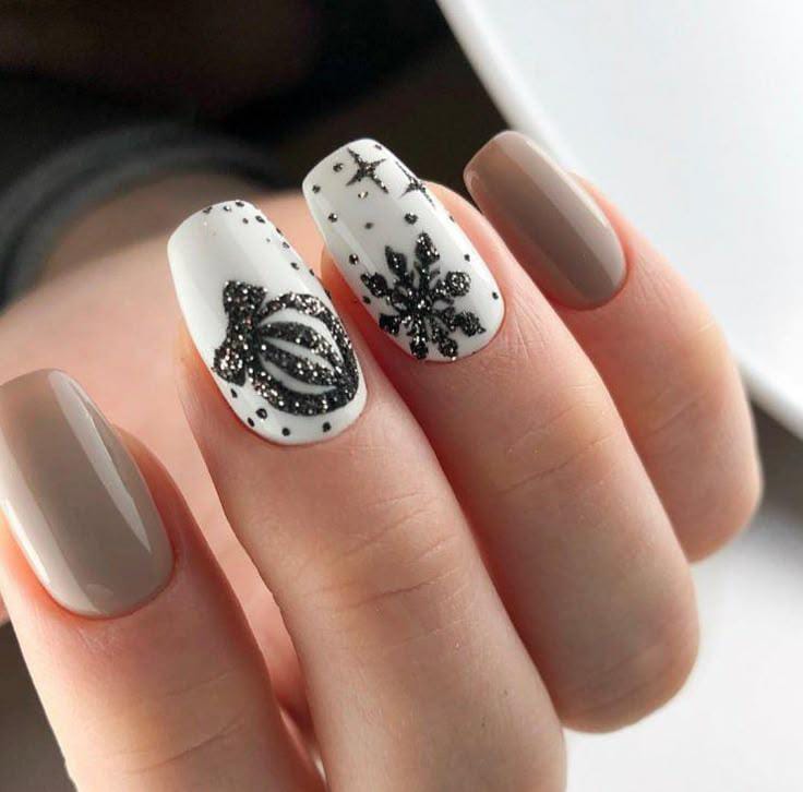 A sophisticated mix of matte taupe and white nails decorated with black glitter snowflakes and ornaments. It’s stylish and minimal, perfect for a modern Christmas look.