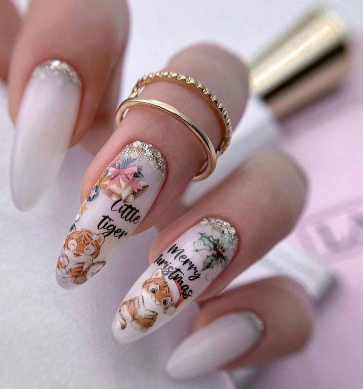 White nails with adorable tiger illustrations, festive holly, and soft glitter tips. This playful design feels warm, cozy, and full of Christmas cheer.