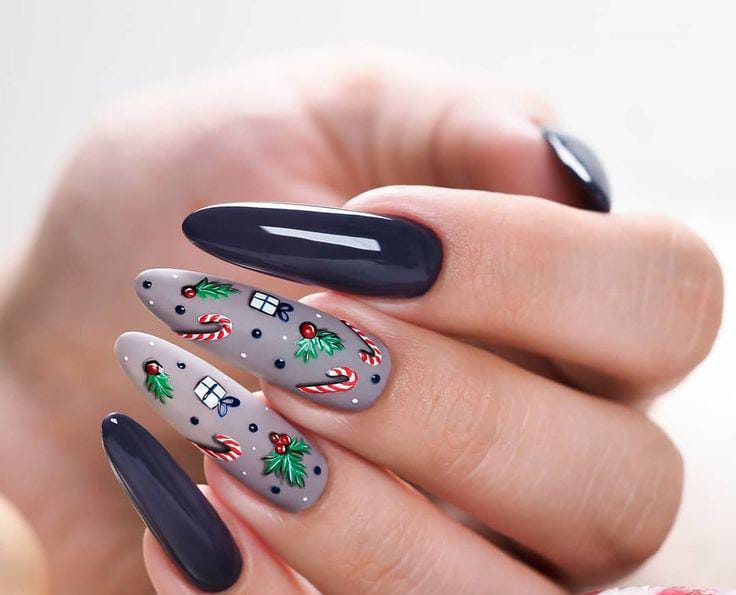 This nail design captures the joyful essence of the holidays with a mix of glossy navy and soft gray tones. Adorned with adorable hand-painted candy canes, holly leaves, little presents, and festive dots, it’s full of cozy Christmas spirit.