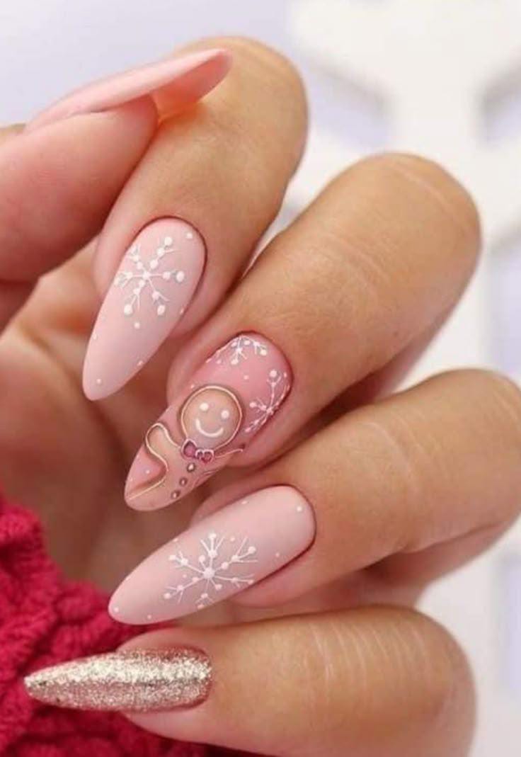 Soft pink tones meet sweet holiday whimsy in this adorable nail design. Featuring delicate white snowflakes and an adorable gingerbread man accent, it perfectly blends cuteness with a wintery, frosted Christmas aesthetic.