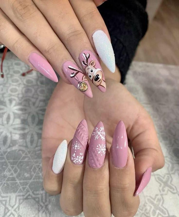 This pretty pink and white nail set captures a cheerful Christmas mood with its mix of soft tones and festive art. The reindeer design adds a fun and playful touch, while the snowflakes and cozy sweater-inspired textures bring warmth and winter magic.