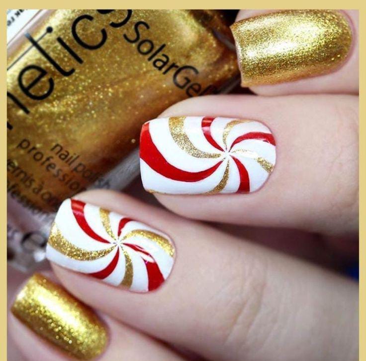 A glamorous twist on the classic candy cane look — shimmering gold pairs with red and white peppermint swirls for a sweet yet elegant Christmas holiday statement.