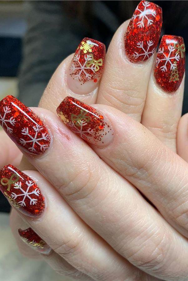 Deep red glitter nails adorned with delicate white snowflakes and golden accents create a dazzling winter wonderland Christmas feel.