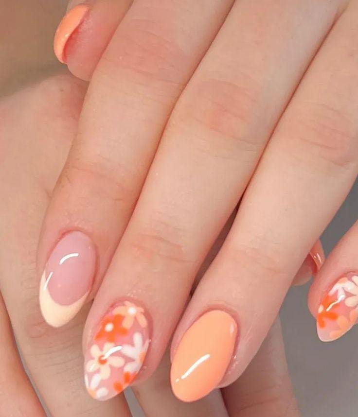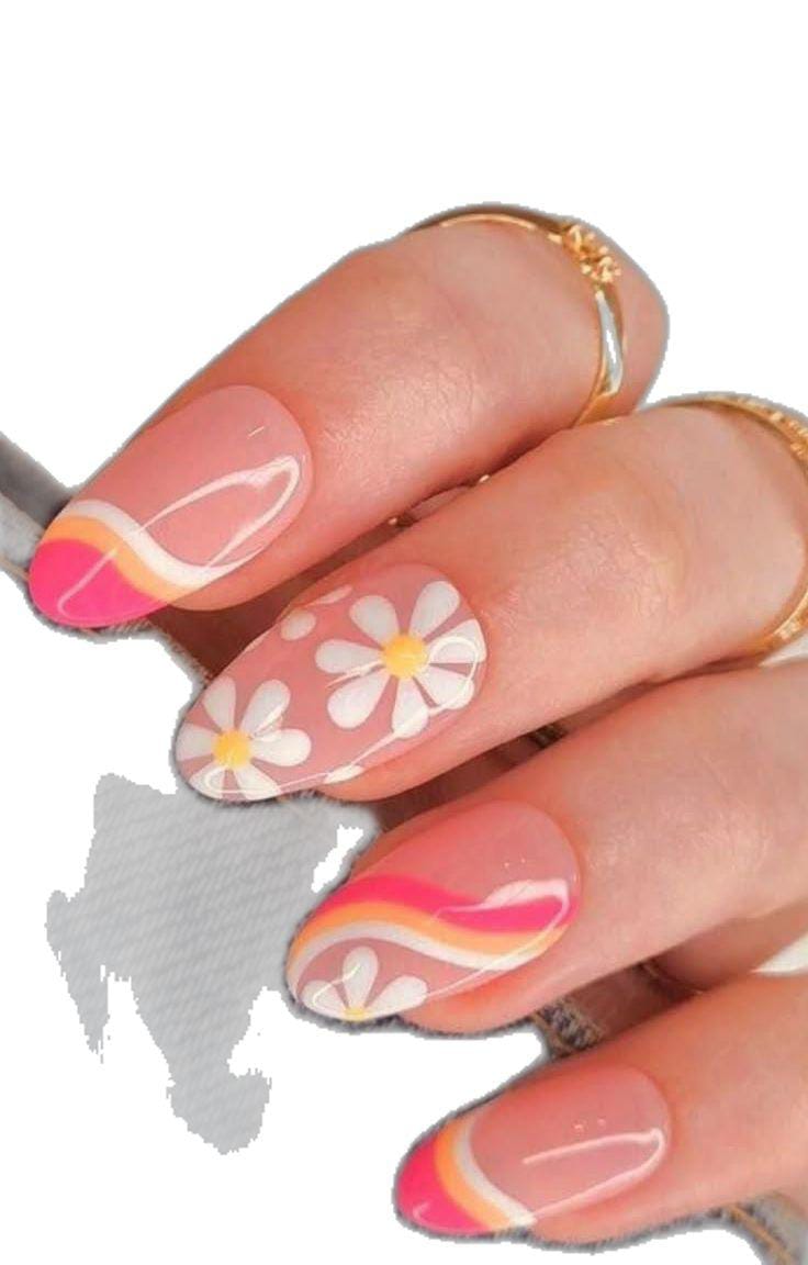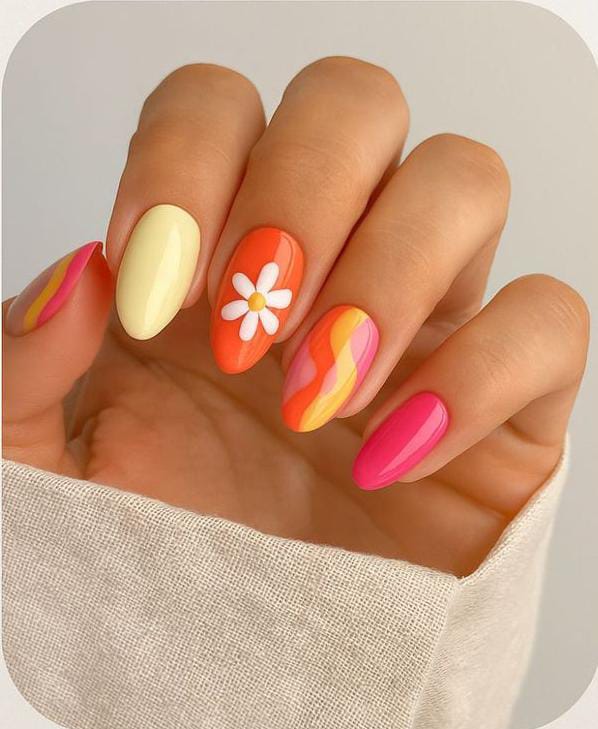 These nails warm summer colors in pink, orange, and butter yellow with soft swirl patterns and a cute floral accent. The design feels fun and retro, giving off a bold yet friendly easy summer vibe.