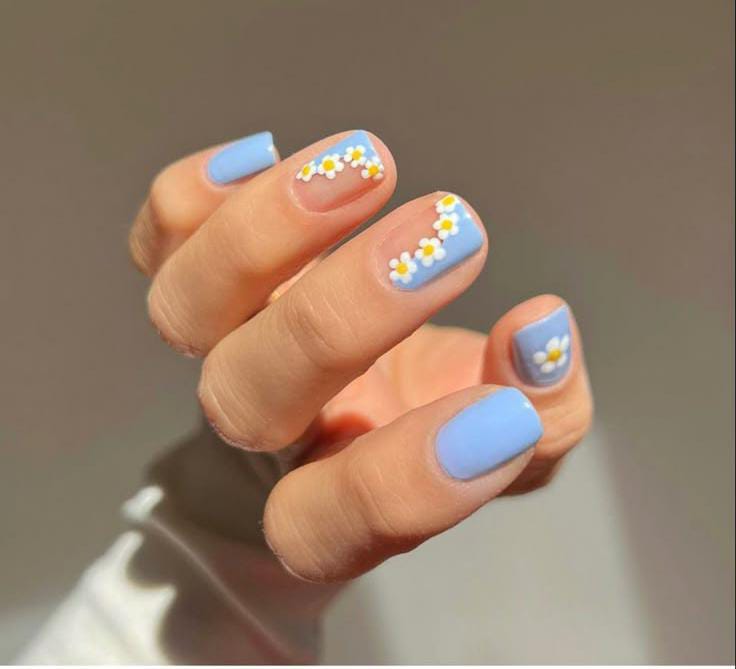 Baby blue nails with tiny white daisy accents give off a calm, sunny-day vibe. The design is playful yet easygoing, making it perfect for a relaxed summer look.