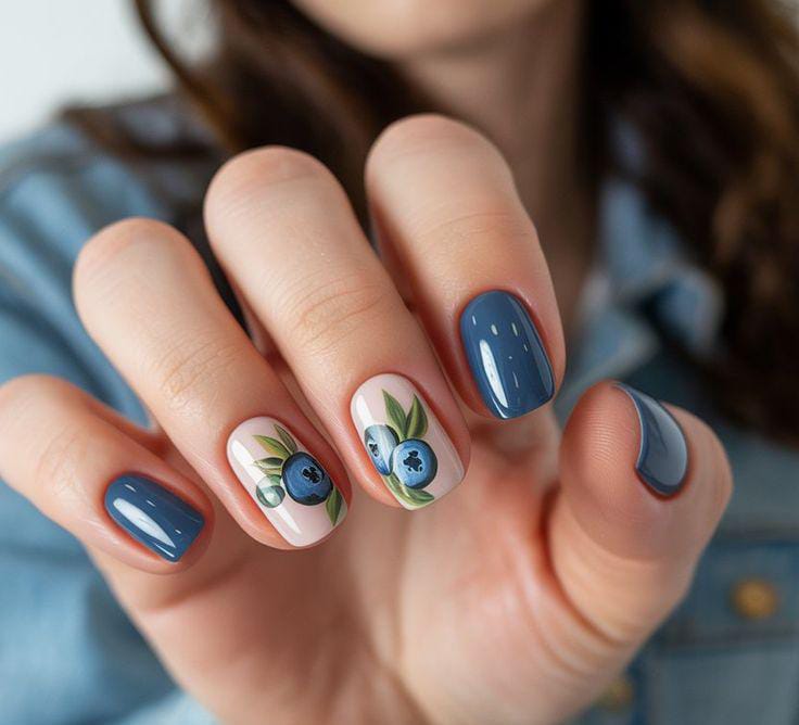 This design mixes soft blue tones with delicate blueberry art for a fresh, summery feel. The look is playful yet calm, perfect for everyday wear with a cute, nature-inspired vibe.