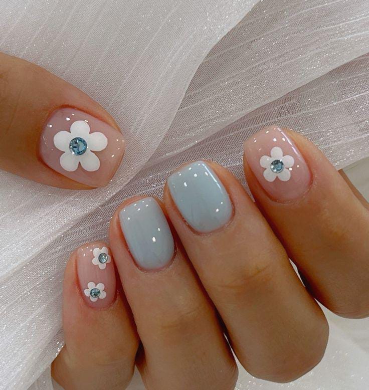 These nails feature light glossy pastel shades paired with tiny white daisies and subtle sparkle, rhinestone on translate accents. The overall style feels gentle, clean, and effortlessly cute—ideal for a soft summer aesthetic.