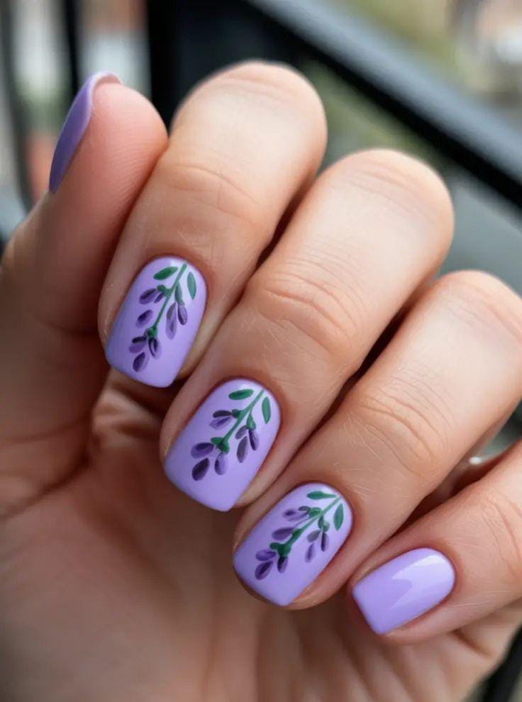 Soft lavender nails with minimal green leaf details create a relaxed and fresh summer look. The design feels airy and elegant, perfect for those who love calm colors with a hint of nature.