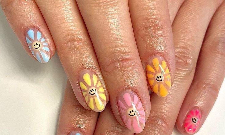 This design features soft pastel bases with playful daisy flowers, each finished with a tiny smiley face in the center. The mix of pink, blue, yellow, and orange gives it a cheerful, carefree, easy summer vibe.