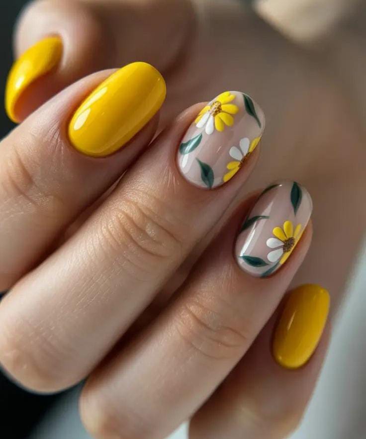 Bright yellow nails are paired with clear or nude bases decorated with simple white-and-yellow daisies. The look feels fresh, clean, and effortlessly summery, perfect for everyday wear.