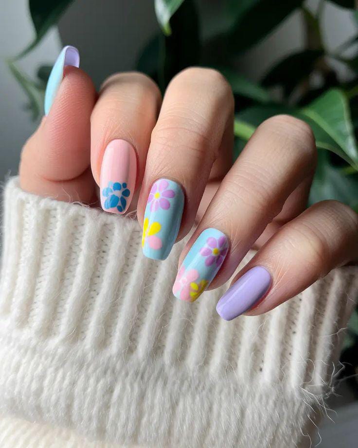 This manicure combines pastel shades like baby blue, pink, and lavender with cute floral accents. The overall vibe is light, youthful, and cozy, with a soft spring-into-summer feel.