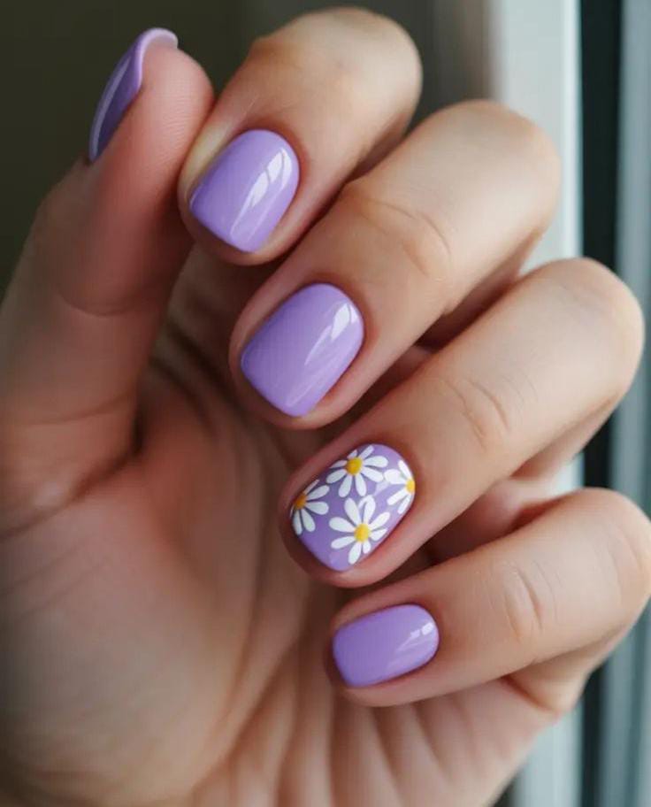 Glossy lavender nails are kept minimal with a single daisy accent nail. The design feels calm and pretty, blending simplicity with a subtle floral summer charm.