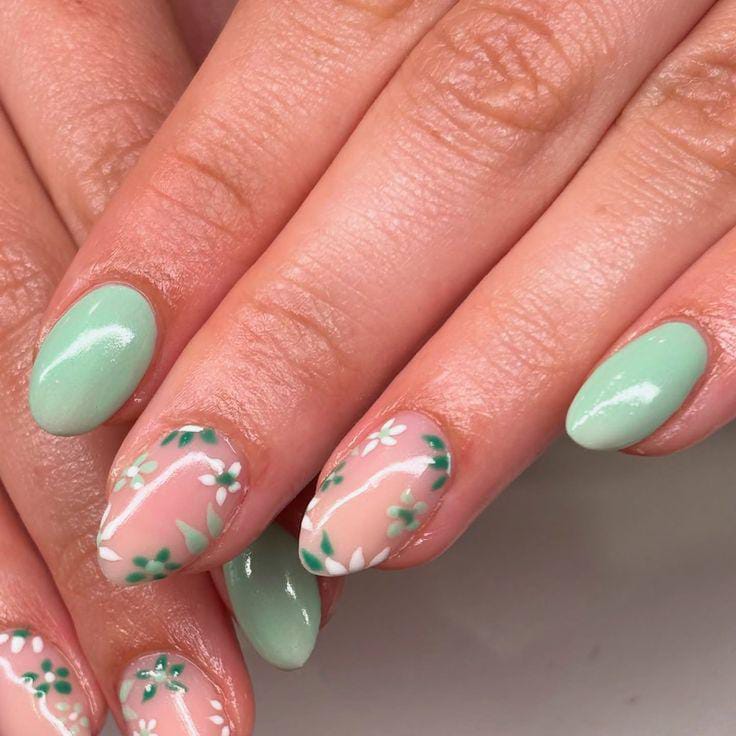 A refreshing mint green pairs beautifully with delicate white and green floral details on nude base. The overall vibe is clean, playful, minimal and perfect for a breezy summer aesthetic.