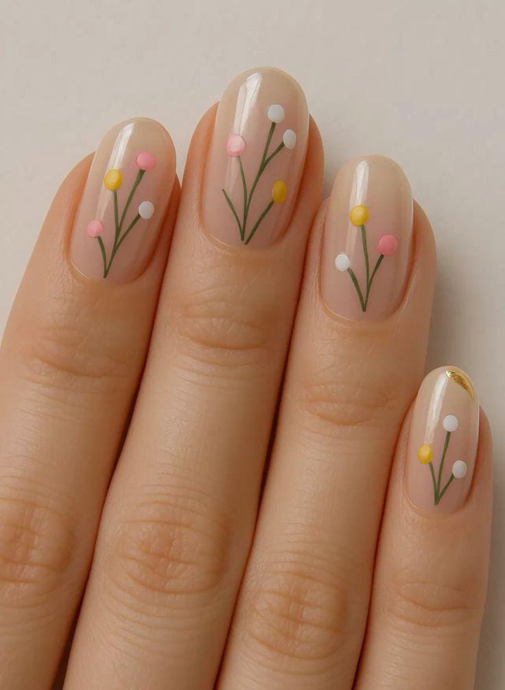 This design features a sheer nude base with tiny pastel flowers-like dots and simple green stems scattered across the nails. The soft pink, yellow, and white color give it a fresh, airy feel that’s perfect for an easy summer look.