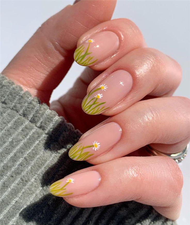 A soft nude base is paired with grassy green tips and delicate white daisies for a playful twist on a French manicure. The overall vibe feels easy, outdoorsy, and inspired by sunny summer fields.