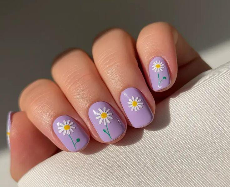 These nails use a smooth lavender base topped with cute white daisies and yellow centers. The look is minimal, cheerful, and perfect for adding a pop of color while still feeling soft and wearable.