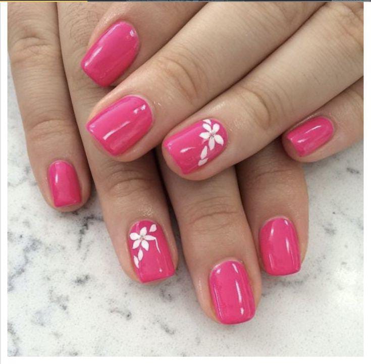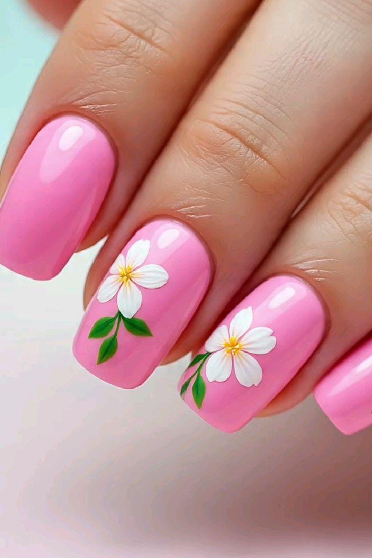 Bright pink nails make a bold summer statement, while white floral accents keep the design cute and fun. The glossy finish and simple flower pattern make it eye-catching without being overdone.