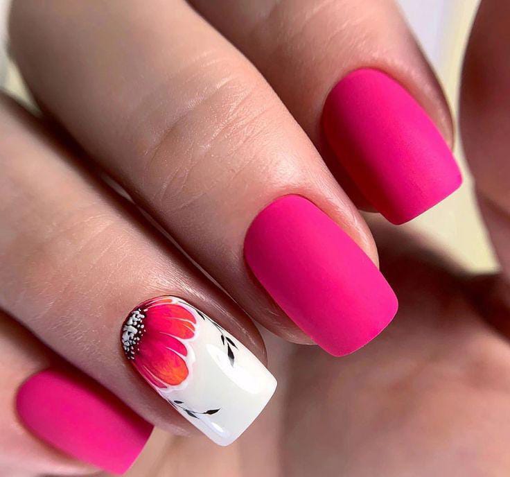This design features bold hot pink nails with a single white accent nail decorated with a soft floral pattern. The mix of bright color and simple flower art gives it a playful, summery vibe that feels fun but still polished.