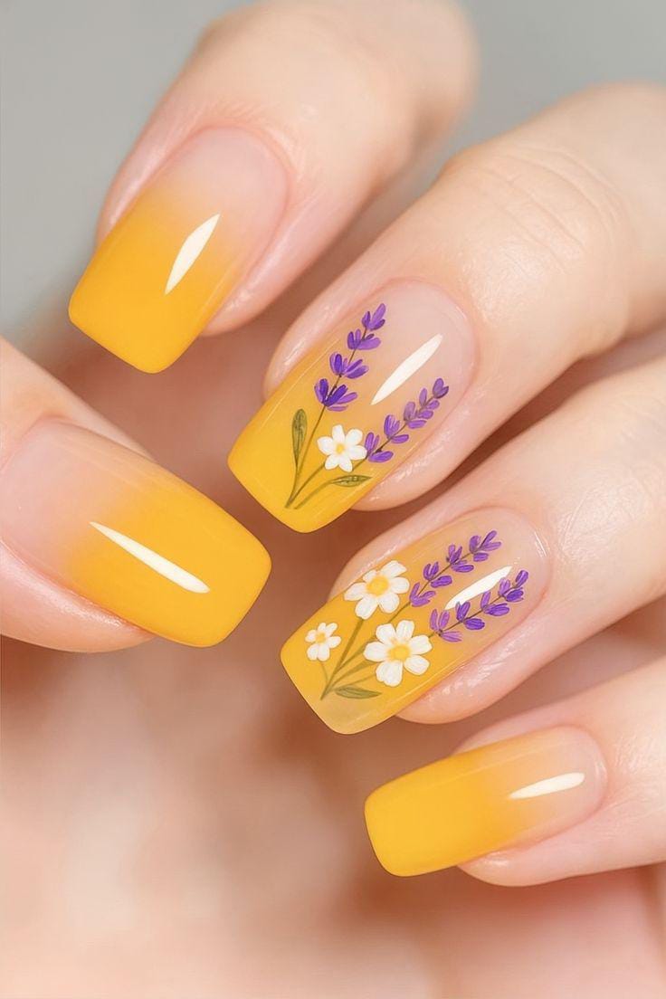 Warm yellow to nude ombre nails are paired with delicate hand-painted flowers in white and purple for a fresh, cheerful look. The floral details add a soft, nature-inspired touch that feels easy and perfect for sunny summer days.