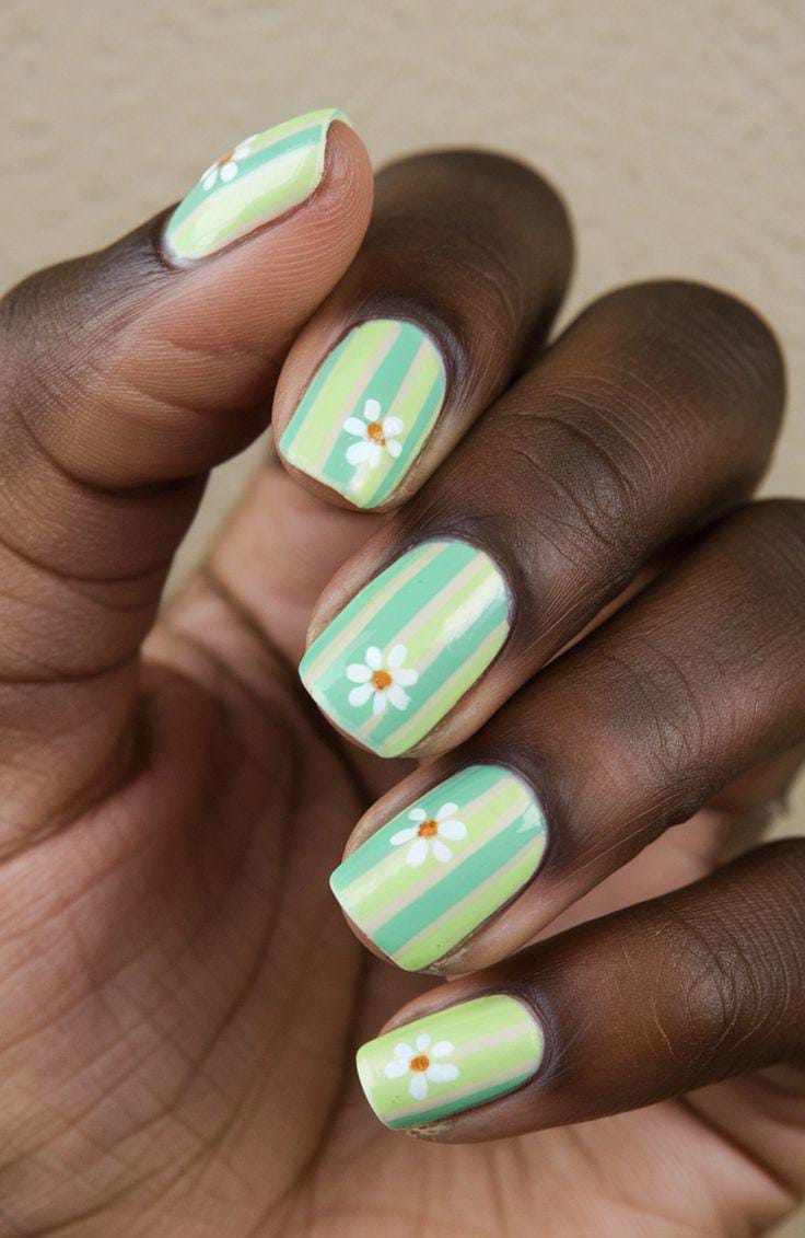 This design combines pastel green stripes with tiny white daisy accents for a cute, relaxed summer feel. The color palette is calm and refreshing, making it ideal for an easygoing, everyday manicure.