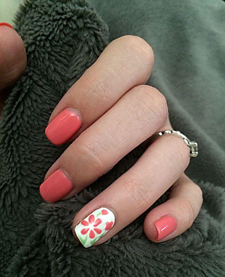 Soft coral nails are matched with a single floral white accent nail in pink tones. The overall look is simple and sweet summer aesthetic, adding just enough detail to keep the design fun without being overdone.