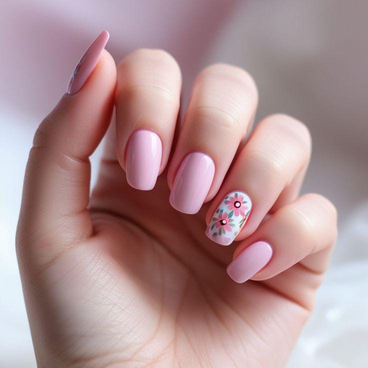 These nails feature a smooth pastel pink base with a single floral accent nail that adds charm without overpowering the look. It’s simple, elegant, and ideal for an easy summer manicure.