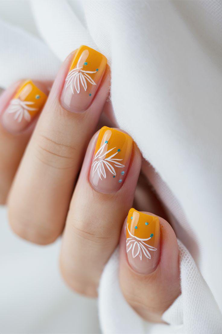 This design mixes a soft nude base with bright mustard-yellow tips for a fresh summer contrast. Delicate white floral line art and tiny dot accents give it a light, cheerful, and artsy feel without being too